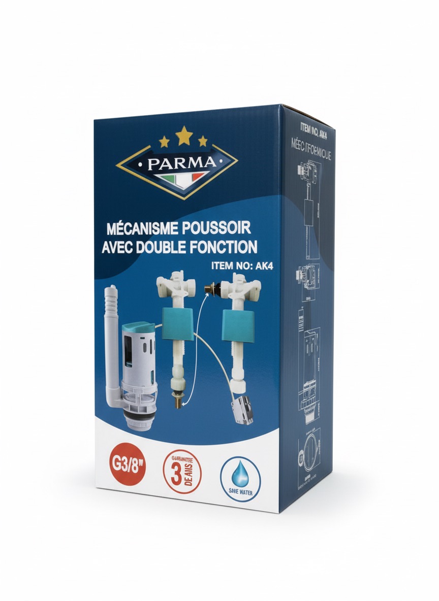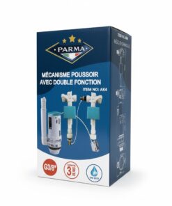 - Ce mécanisme poussoir à double fonction permet d’actionner une chasse d’eau de toilette, offrant un choix entre un petit et un grand volume d’eau.