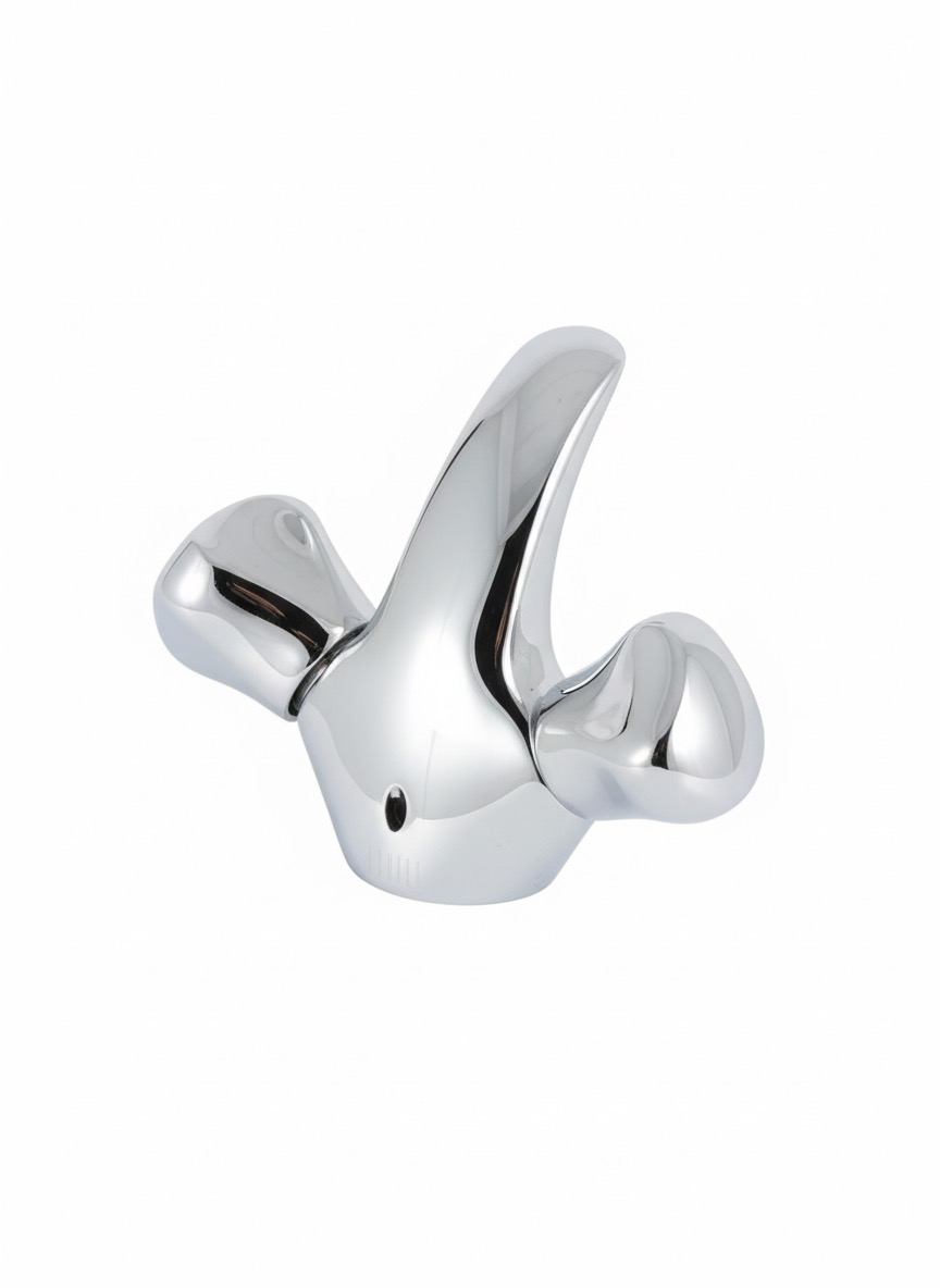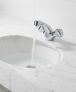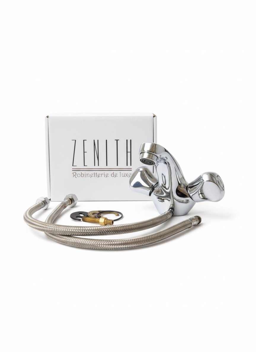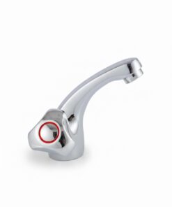 Ce robinet de lavabo est un mélangeur chromé compact avec deux commandes ergonomiques pour l’eau chaude et l’eau froide et un bec court et incliné.