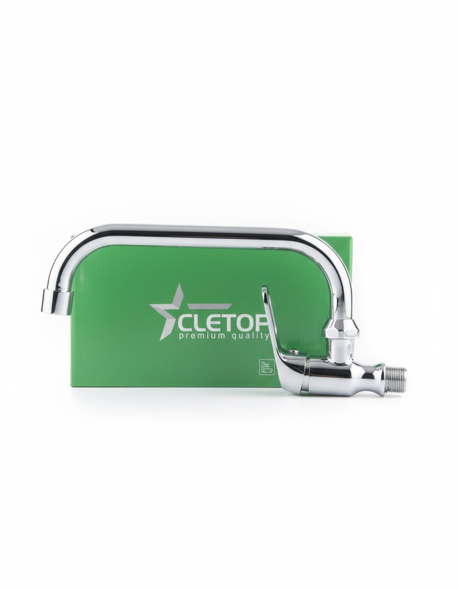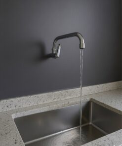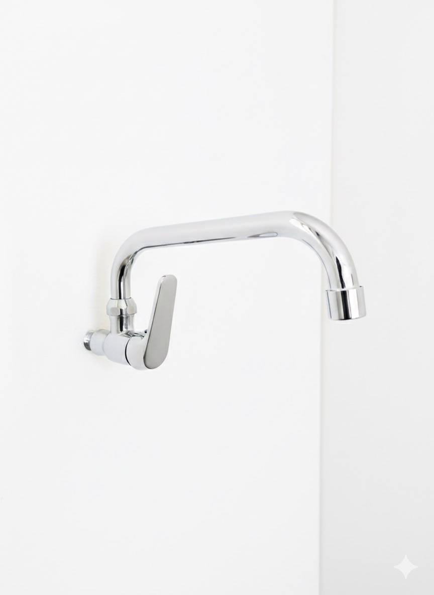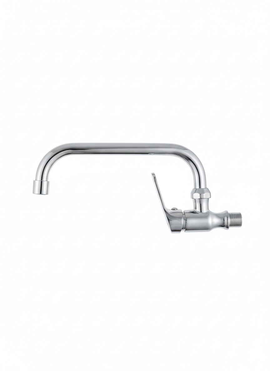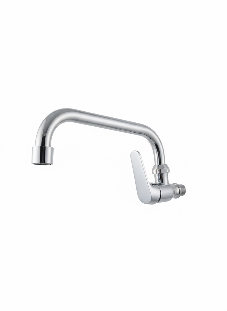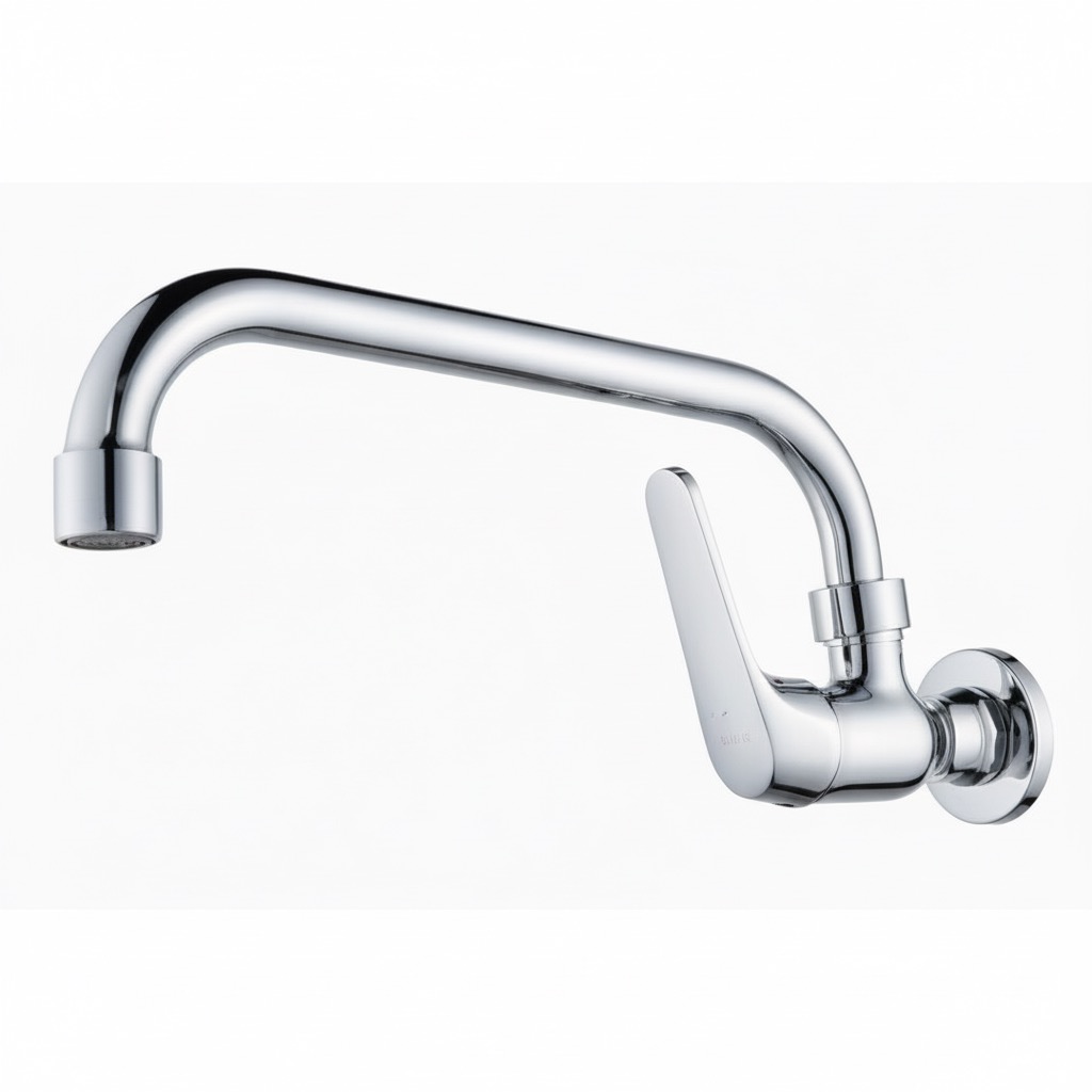 Robinet mural mono-commande avec un long bec courbé, fini en chrome poli, idéal pour un montage direct sur la surface du mur.