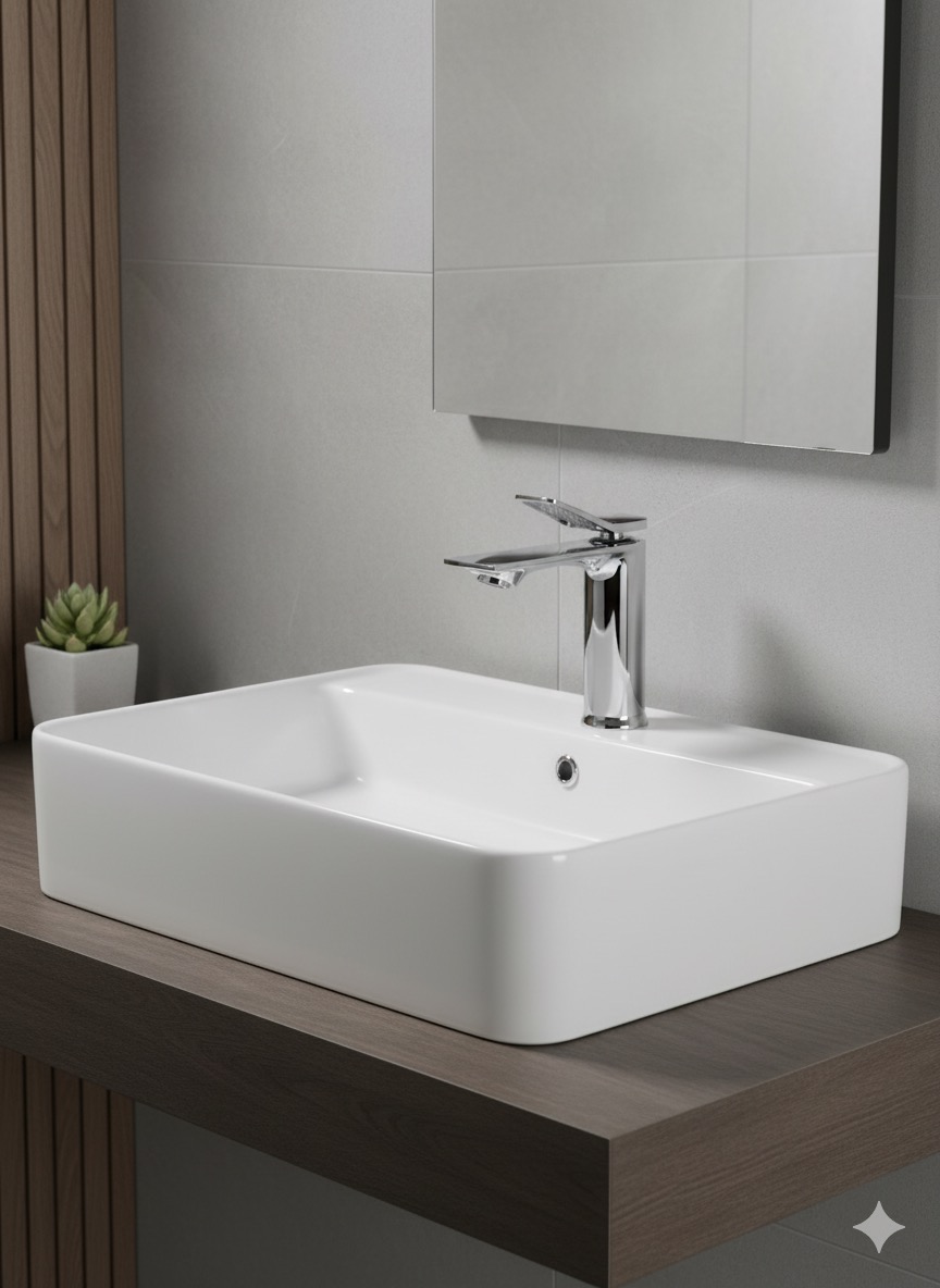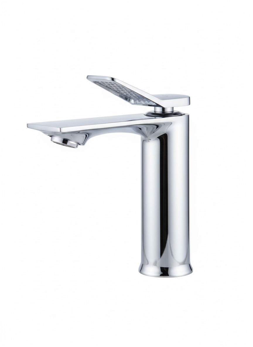- Mitigeur de lavabo surélevé au design élégant, avec une finition chromée brillante et un bec plat élancé.